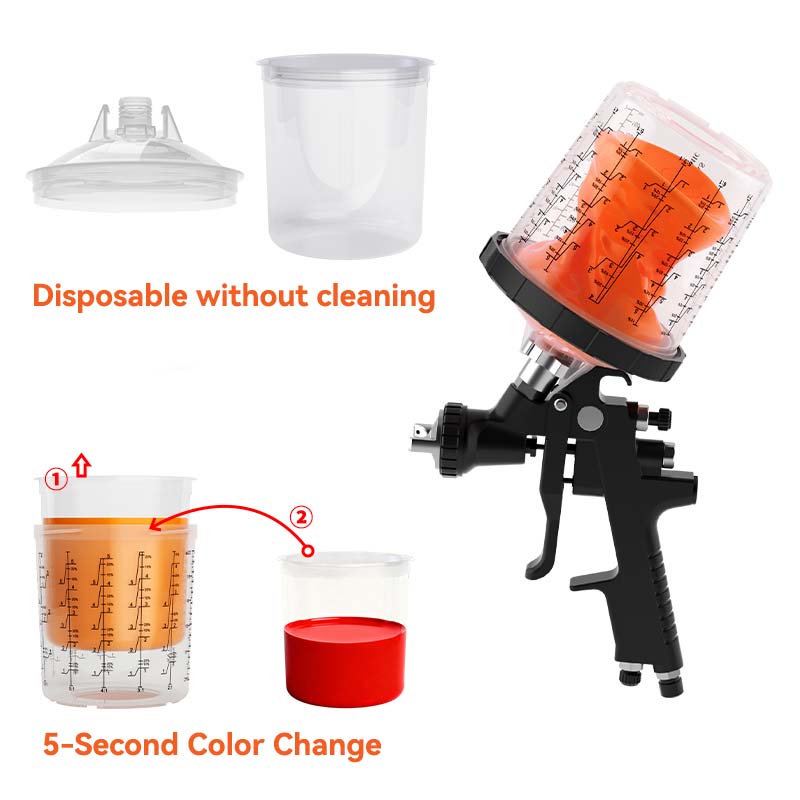 वर स्विच कराडिस्पोजेबल स्प्रे गन कपआणि ऑटोमोटिव्ह टच-अप, फर्निचर कोटिंग आणि सर्व प्रकारच्या पेंट जॉब्स सुलभ करा. वेळेची बचत करा, त्रास कमी करा आणि सुरुवातीपासून शेवटपर्यंत सुरळीत ऑपरेशन्सचा आनंद घ्या.