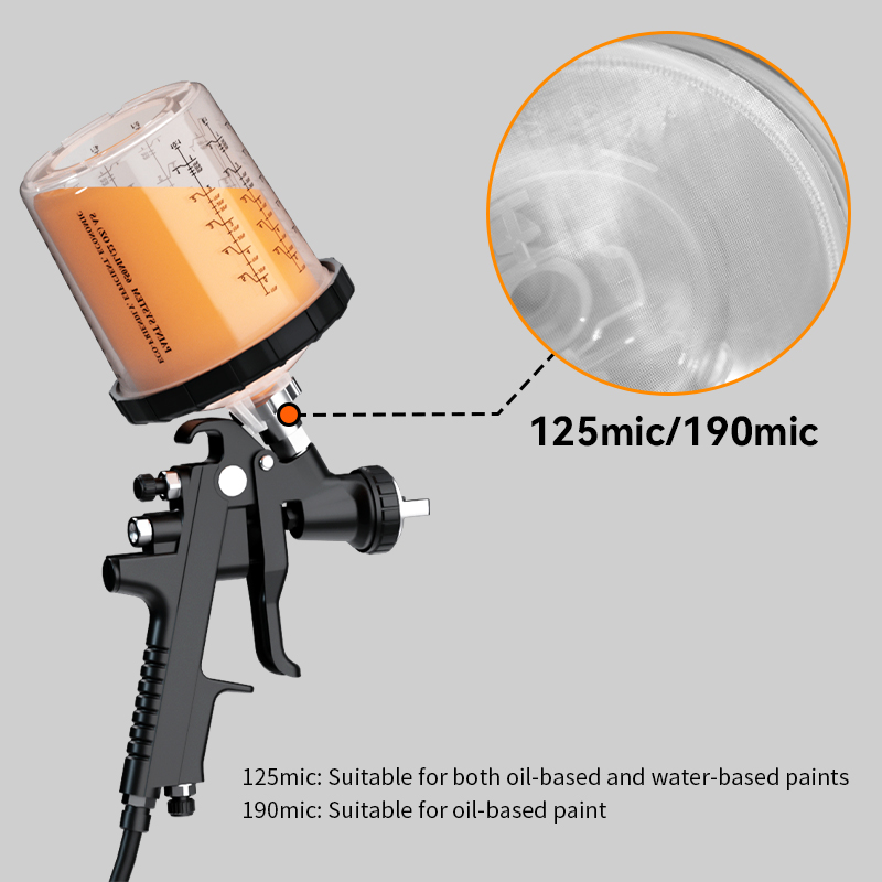 • उत्कृष्ट पेंट फिनिशसाठी अंगभूत एकात्मिक फिल्टर: डिस्पोजेबल स्प्रे कप कॅपमध्ये अंगभूत 190μ (तेल-आधारित पेंट) आणि 125μ (पाणी-आधारित पेंट) फिल्टर आहेत, जे फवारणीदरम्यान प्रभावीपणे अशुद्धता फिल्टर करतात आणि पेंट ग्लॉस 20% वाढवतात.